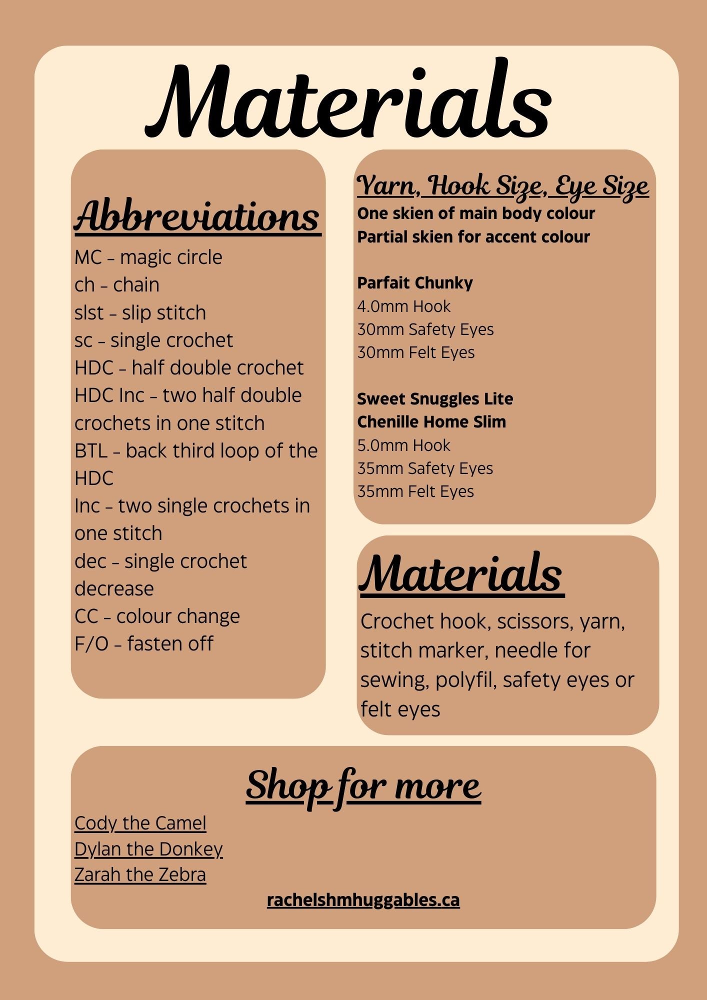 Materials list, abbreviation guide, and yarn/hook size recommendations