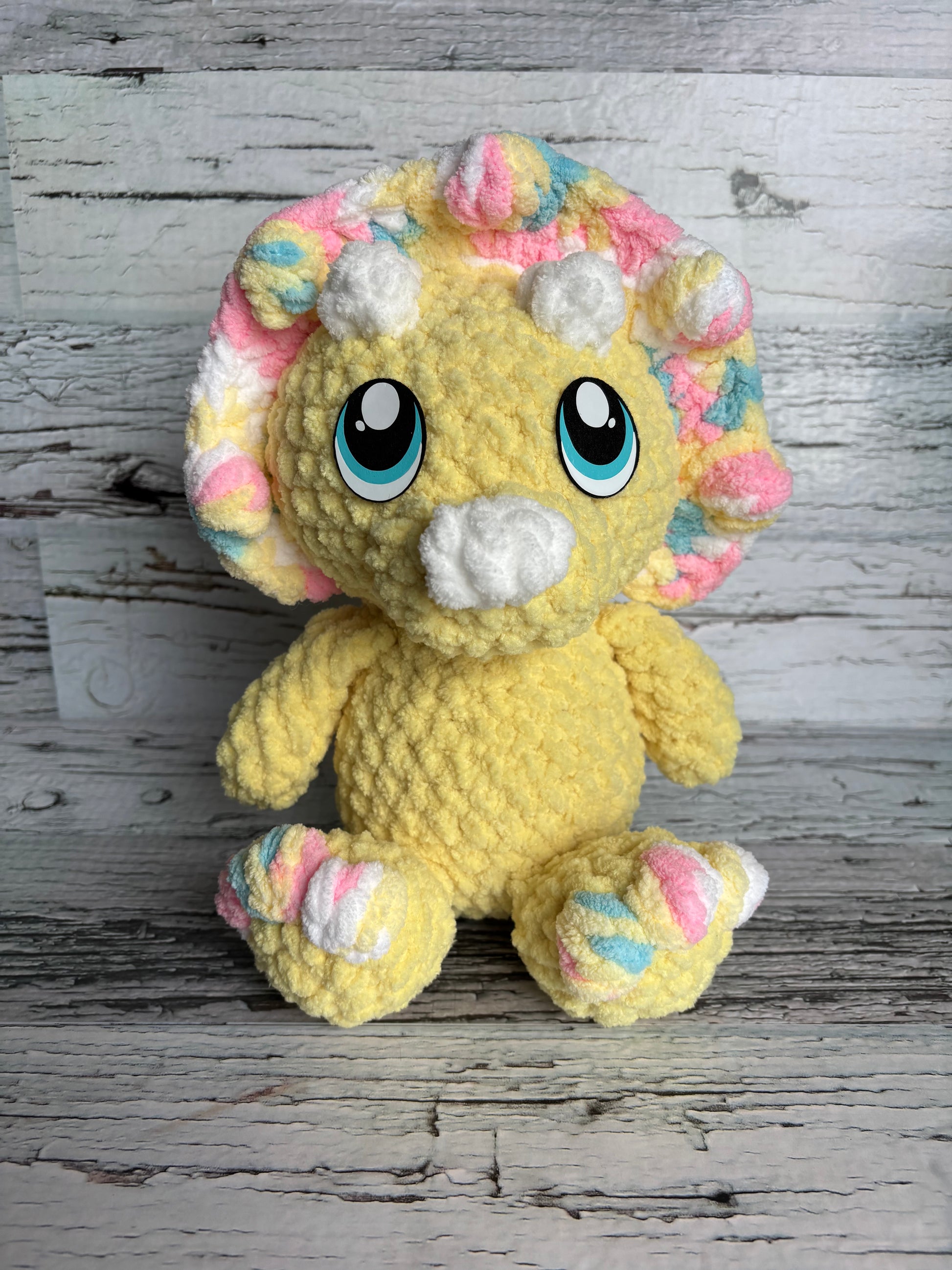 Meet your new prehistoric pal! This Triceratops Huggable Plushie is the perfect snuggly companion for kids and dino lovers alike. Handmade with ultra-soft polyester yarn and filled with squishy polyfil, this plushie is built for cuddles. Its oversized felt eyes and chubby features give it a charming, wide-eyed look that’s impossible to resist. From playtime to bedtime, this plush dinosaur is always ready for an adventure!